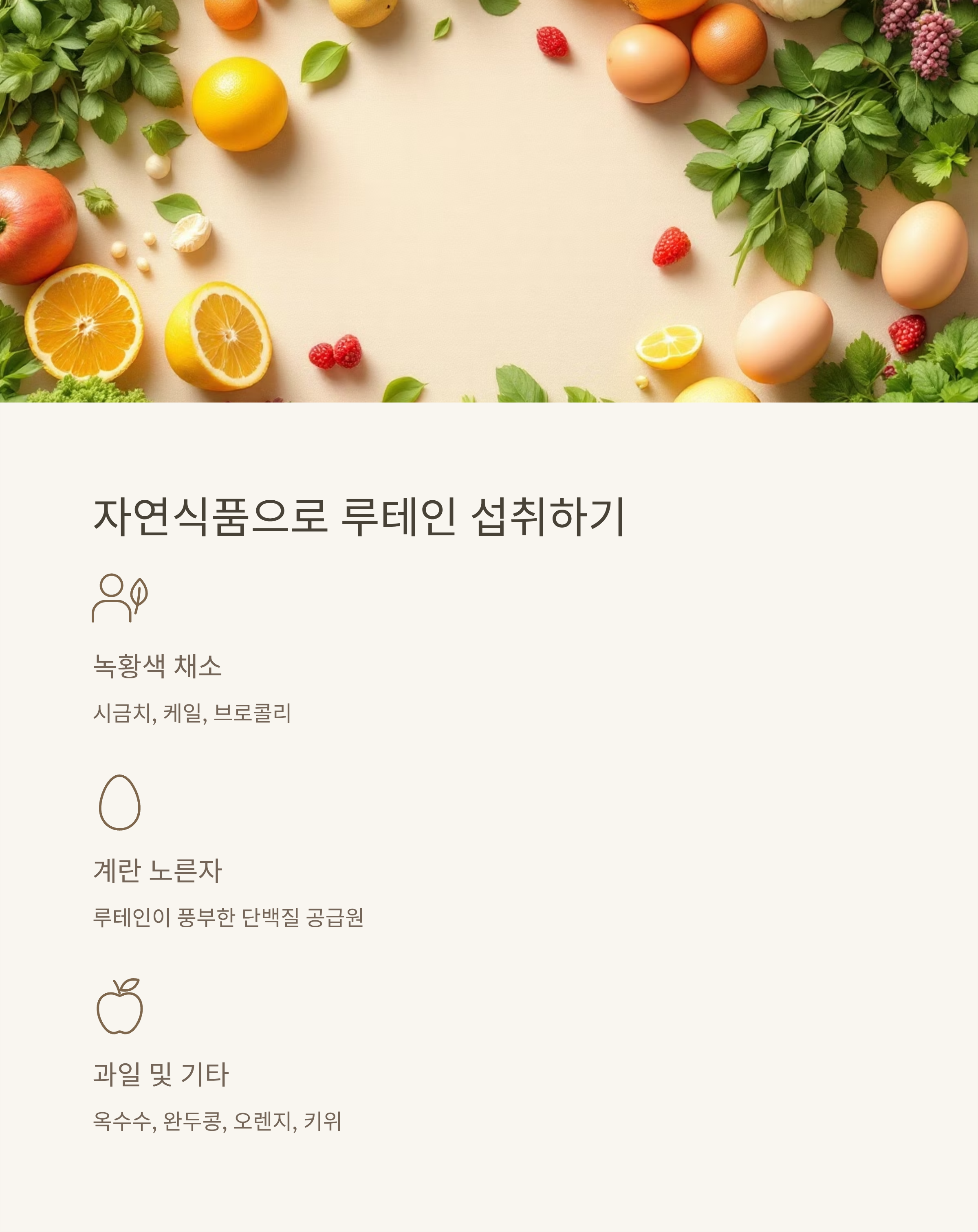 음식(시금치, 케일, 달걀 노른자 등)으로 자연스럽게 섭취하거나, 보충제를 복용할 때 식사 후 기름기 있는 음식과 함께 섭취하면 흡수율이 높아집니다. 또한, 장기 복용 전에는 전문가 상담을 받는 것이 안전합니다.