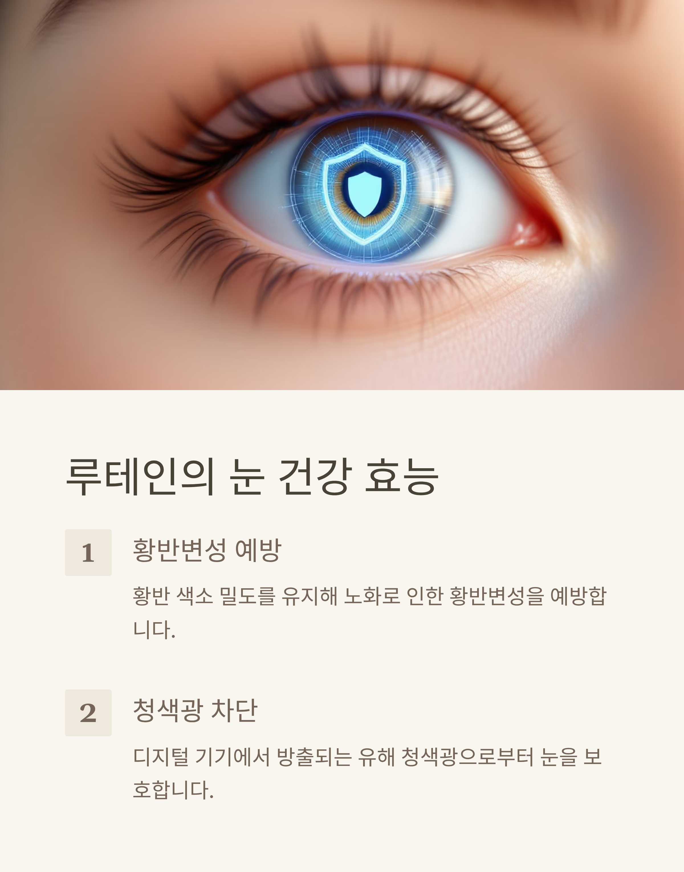 우리 눈은 매일 강한 자외선과 전자기기에서 나오는 청색광에 노출되는데, 루테인은 이런 유해 빛으로부터 눈을 보호하는 ‘천연 선글라스’ 역할을 합니다.